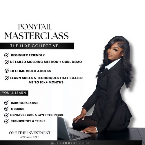 This masterclass is designed for established/aspiring hairstylists looking to refine their technique and create sleek, high-end ponytails with techniques that can also be transferred to Quickweaves, Updowns, Updos, and Lace Installations